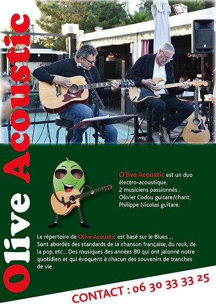 Tout au long de leur carrière, les membres de O'live acoustic ont su gagner leur public au cours de nombreuses prestations et animations musicales, aussi bien dans des soirées privées que dans des Pub's de la région.